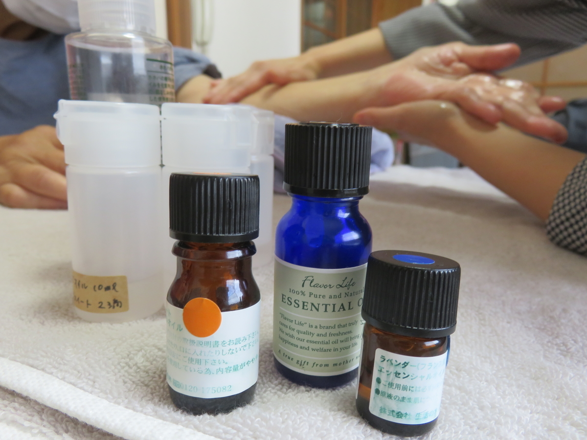 3種類のアロマクリーム(ベルガモット、ラベンダー、オレンジ)の中から、好きな香りを選んで、指先からひじまでをゆっくりとケアをしてもらいます。