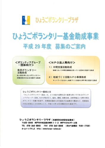 募集期間:平成29年4月17日(月)〜平成29年5月31日(水) ひょうごボランタリー基金助成事業 平成29年度 地域づくり活動NPO事業助成 平成29年度 中間支援活動助成